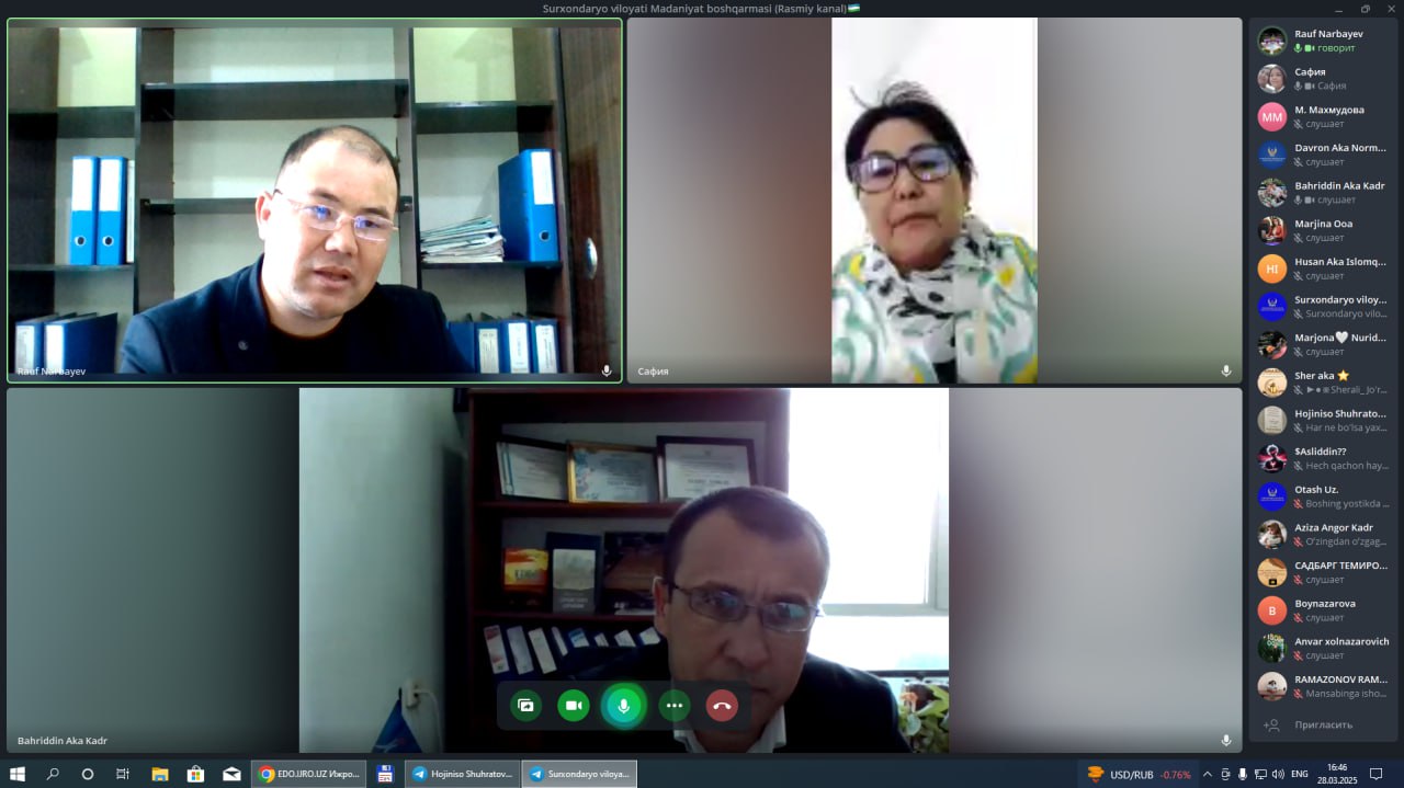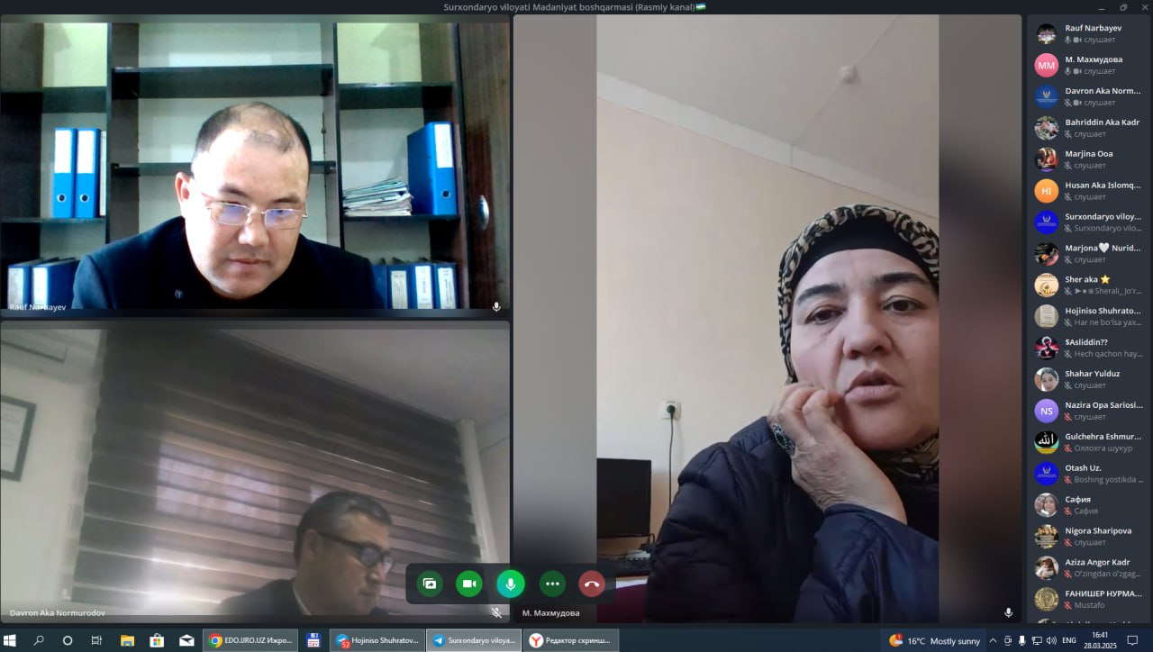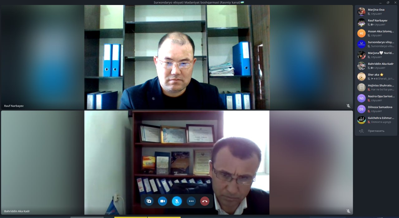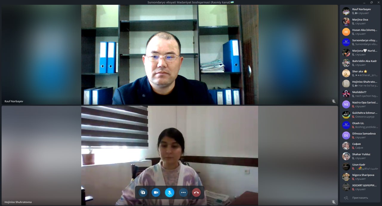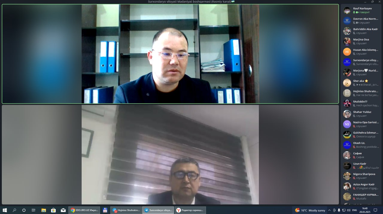 Joriy yilning 28-mart kuni Surxondaryo viloyati Madaniyat boshqarmasi boshlig‘i vazifasini vaqtincha bajaruvchi Narbayev Rauf Abdullayevichning jismoniy va yuridik shaxslar bilan "Onlayn qabuli" bo‘lib o‘tdi.