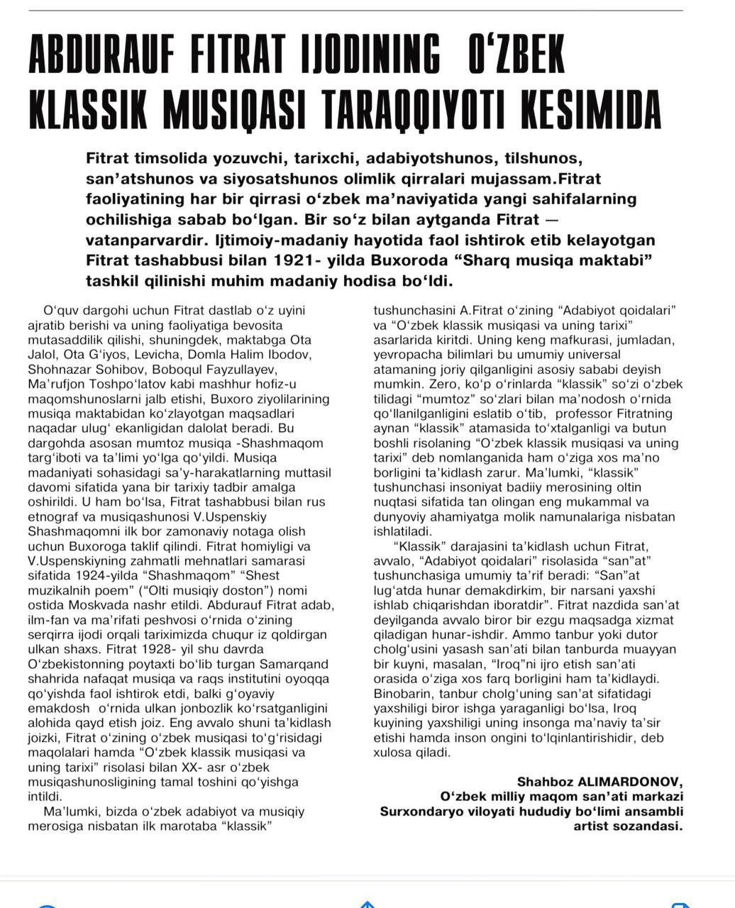 O'zbek milliy maqom san'ati markazi Surxondaryo viloyati hududiy bo'limi ansambli artist sozandasi Shaxboz Alimardjnovning maqolasi