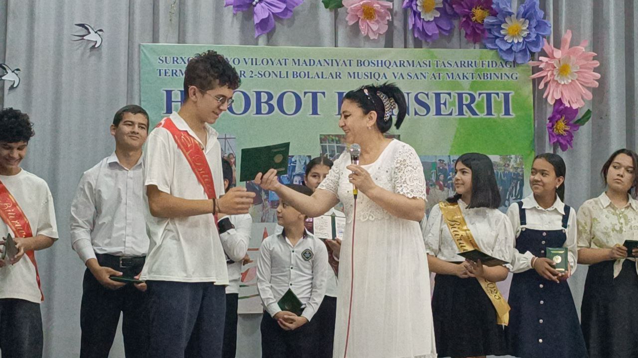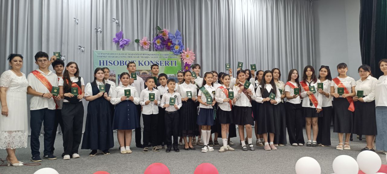 Termiz shahar 2- sonli bolalar musiqa va san'at maktabida besh va yetti yillik mutaxasislik yo'nalishlarida taxsil olgan bitiruvchilarga musiqa maktabini tamomlaganlik to'g'risidagi guvohnomalar topshirildi
