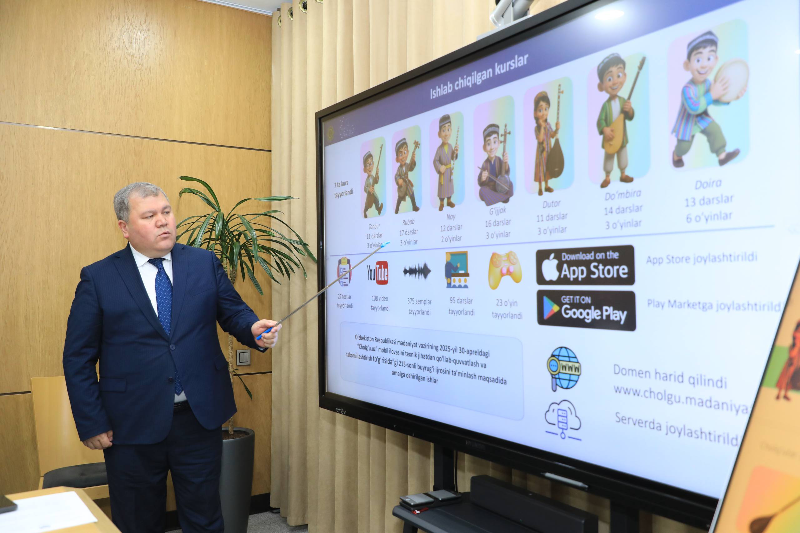 Dastavval “Cholg‘u.uz” mobil ilovasi bilan tanishildi. Unda, ta’lim jarayonida mobil ilovaning foydalanish uchun qulayliklari va afzalliklari haqida Yunus Rajabiy nomidagi O‘zbek milliy musiqa san’ati instituti rektori Eldor Shermanov ma’lumot berdi.
